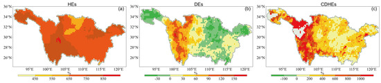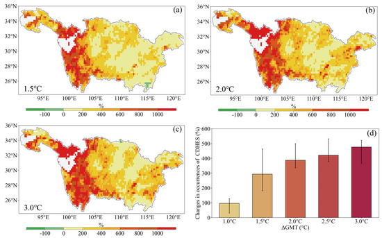 Figure 3 exhibits the occurrence changes in HEs, DEs, and CDHEs with a 2 °C GMT increase. Figure 3a indicates that the entire YRB is characterized by an increase in HEs, particularly in the southwestern YRB, where the largest percentage increase (855%) will occur. Nevertheless, it can be observed from Figure 3b that the variations in the DEs are more complicated than those in the HEs in the YRB. The distribution characteristics of the DEs are almost completely opposite to the spatial distribution features of precipitation discussed in Section 4.1. Specifically, while the source, middle, and lower reaches of the YRB will witness a decrease in DEs, the upper reaches will experience a significant increase, with the highest percentage exceeding 150%. The increase in total precipitation (as shown in Figure 2b) and DEs (as depicted in Figure 3b) indicates that heavy rainfall events will also be on the rise in the YRB in the future. This phenomenon further indicates that the interannual distribution of precipitation in the YRB will become more uneven in the future, characterized by an increase in flooding events and the frequent occurrence of droughts. This will pose greater challenges to water resource management.