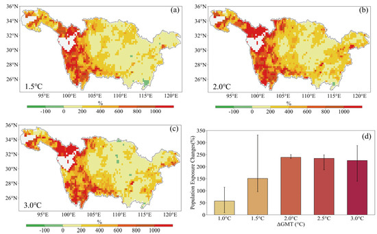 At warming levels of 1.5 °C, 2.0 °C, and 3.0 °C, the population exposure across almost all areas of the Yangtze River Basin increases. The frequency of the population exposure is projected to increase by approximately 150.8%, 238. 6%, and 225.5% in a 1.5 °C, 2.0 °C, and 3.0 °C warmer world compared to the present period, respectively.