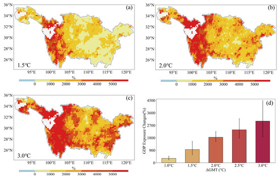 Given the growing trend of CDHEs, it is crucial to estimate the changes in population and GDP exposure to CDHEs to aid in designing effective mitigation strategies in response to climate change. The relative changes in population exposure in YRB are investigated for different warming levels (Figure 5). The spatial patterns of changes in population exposure at 1.5 °C, 2.0 °C, and 3.0 °C are largely similar to the CDHEs (Figure 4), with significant increases primarily concentrated in the southwestern region of the YRB. At warming levels of 1.5 °C, 2.0 °C, and 3.0 °C, the population exposure across almost all areas of the Yangtze River Basin increases. Figure 5d illustrates the changes in population exposure relative to the reference period across warming scenarios of 1.0 °C, 1.5 °C, 2.0 °C, 2.5 °C, and 3.0 °C. Notably, once warming exceeds 2 °C, the augmentation in population exposure consistently surpasses 200% in comparison to the baseline period (1985–2014), which essentially means a 2.0-fold increase in population exposure if no mitigation strategies are implemented. This underscores the critical importance of adopting and enforcing effective climate change mitigation strategies to minimize the adverse impacts on population exposure. Specifically, the frequency of the population exposure is projected to increase by approximately 150.8% in a 1.5 °C warmer world, by approximately 238.6% in a 2.0 °C warmer world, and by approximately 225.5% in a 3.0 °C warmer world compared to the present period. The increase in population exposure relative to the present period peaks at a 2 °C warming scenario, followed by a slight decline (Figure 5d), which may be attributed to the declining demographic trend, as supported by Figure S2 in the Supplementary Materials.