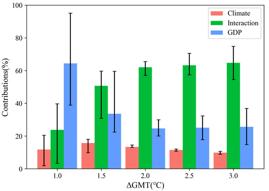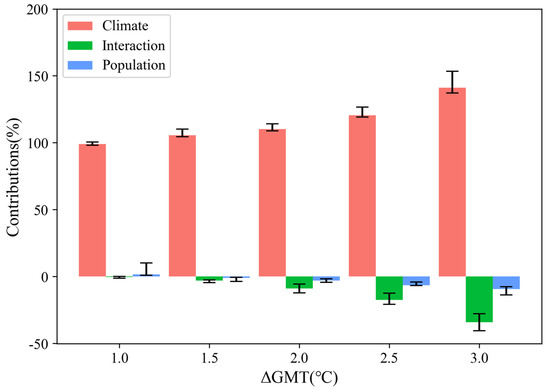 where , , and represent relative contributions of climate change, population/GDP change, and population/GDP–climate interaction, respectively.