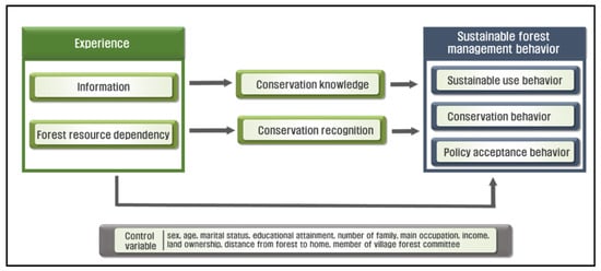 Based on the literature review, we developed a conceptual framework showing the relationships between experience (forest resource dependency and access to information) and sustainable forest management, encompassing sustainable use, conservation, and policy acceptance behaviors (Figure 1). We argue that forest resource dependency and information on forest conservation will result in increased conservation recognition and knowledge, which could ultimately influence sustainable use, conservation, and policy acceptance behaviors. We also argue that the overall goal of sustainable forest management behavior could be affected by socio-demographic factors, including educational attainment, income, land ownership, occupation, member of village forest committee, sex, age, marital status, family size, and distance from forest to home).