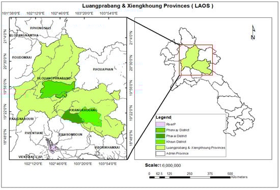 The target area for this research comprised 15 villages across three districts (Phonxai, Sunloung, and Phaxay) spanning two provinces (Luang Prabang and Xieng Khouang, Lao PDR) (Figure 2). These villages are situated 2–3 km from the nearest forests. Among the 15 villages, we selected 5 near the forest in the Phonxai District (Luang Prabang Province), 5 in the Khoune District, and 5 in Phaxay District (Xieng Khouang Province). Specific details of the locations are as follows: Chobchia, a sub-district in Phonxai district, Luang Prabang Province, located in UTM Zone 48Q at latitude 19°96′86.67″ N and longitude 102°60′08.01″ E, covering a forest area of approximately 13.438 ha (55.2%); Sunlong, a sub-district in Khoun district, Xieng Khouang Province, situated in UTM Zone 48Q at latitude 19°23′17.29″ N and longitude 103°37′20.51″ E, with a forest area of about 27.573 ha (11.4%); Namsiem, a sub-district in the Phaxay district, Xieng Khouang Province, located in the UTM Zone 48Q at latitude 19°21′17.56″ N and longitude 103°07′16.09″ E and latitude 19°12′50.03″ N and longitude 103°23′02.11″ E, covering a forest area of approximately 22.673 ha (20.2%) (Report of district, 2016). Each district is categorized into three main types under forestry law, with specific areas allocated to protected forests: approximately 8,044,800 ha nationwide; conservation forests: approximately 4,409,700 ha; and production forests: approximately 3,146,800 ha [6]. The distribution of production forest areas across different regions is as follows: northern region: approximately 969,222 ha (39.0%); central region: approximately 1.3 million hectares (52.4%); southern region: approximately 217,100 ha (9%) [4]. The three subdistricts encompass 15 villages, totaling 1104 households and approximately 6868 inhabitants, including 3378 females. The population comprises three ethnic groups: Lao Loum, Lao Soung, and Khumou. Human settlements are situated along roads, valleys, and rivers, and face high risks of natural disasters, including flooding and soil erosion. This area suffers from poor road conditions that hinder accessibility, limited infrastructure development, and low education levels, contributing to slow economic growth. Due to the unavailability of land for food production and rice fields, many residents are impoverished and rely on forest resources for sustenance and income through activities including woodcutting and collecting non-timber forest products (NTFPs). The illegal encroachment on fruit and rubber plantations has exacerbated these challenges. Moreover, there is a lack of awareness among villagers, particularly the youth, regarding the importance of forest resource conservation.
