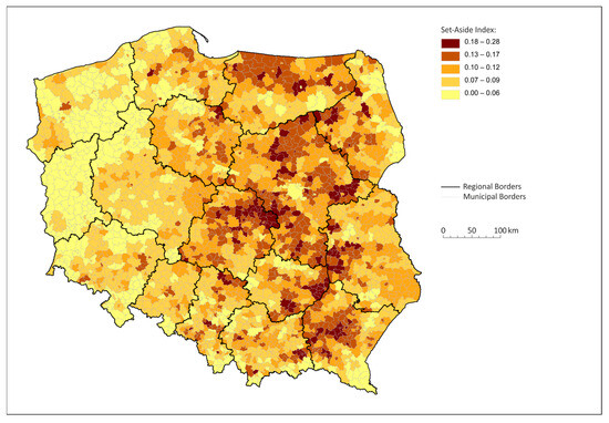 In the case of the econometric analysis of factors determining set-aside in Poland, the aforementioned index of set-aside is spatially aggregated to the municipal level. This approach has been applied due to the availability of data on investigated independent variables enabled by Statistics Poland [54]. Moreover, as data on certain independent variables are collected exclusively through the Agricultural Census, with the most recent census data available from 2020, the data for all other independent variables were also collected for 2020.