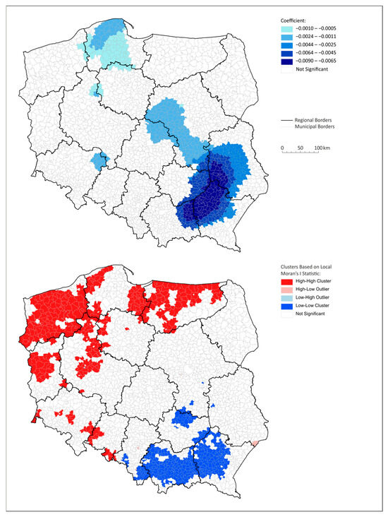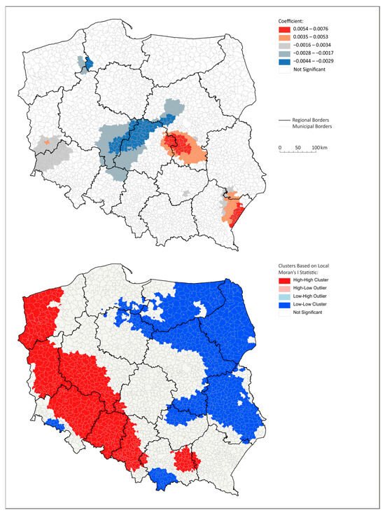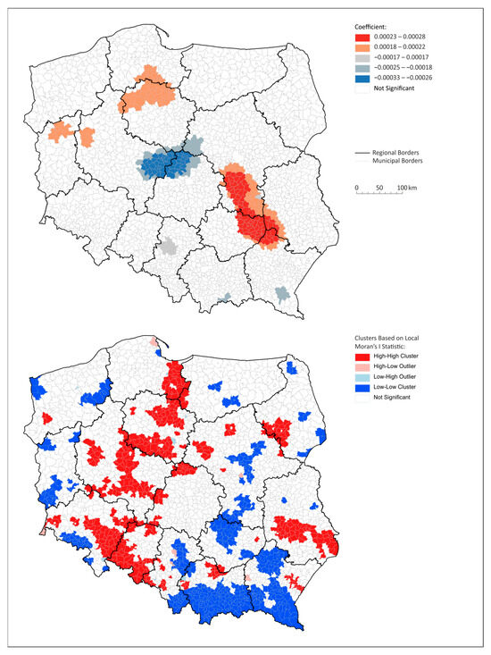 Local clusters of the water surface rate and local impacts of the variable on the magnitude and frequency of set-aside practices (2014–2023). Source: Own elaboration using local coefficients estimated by Geographically Weighted Regression (GWR) and Local Moran’s I statistics in ArcGIS. Comment: The bandwidth was fixed at 110.0 km for GWR and 17.8 km for Local Moran’s I and estimated using the Euclidean nearest neighbor approach.