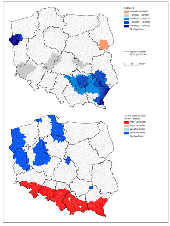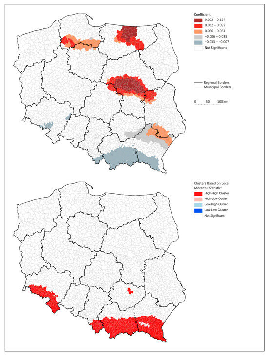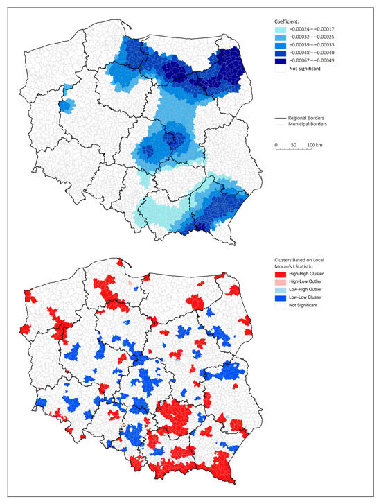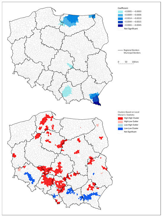 Local clusters of the average farm size values and local impacts of the variable on the magnitude and frequency of set-aside practices (2014–2023). Source: Own elaboration using local coefficients estimated by Geographically Weighted Regression (GWR) and Local Moran’s I statistics in ArcGIS. Comment: The bandwidth was fixed at 110.0 km for GWR and 17.8 km for Local Moran’s I, and estimated using the Euclidean nearest neighbor approach.