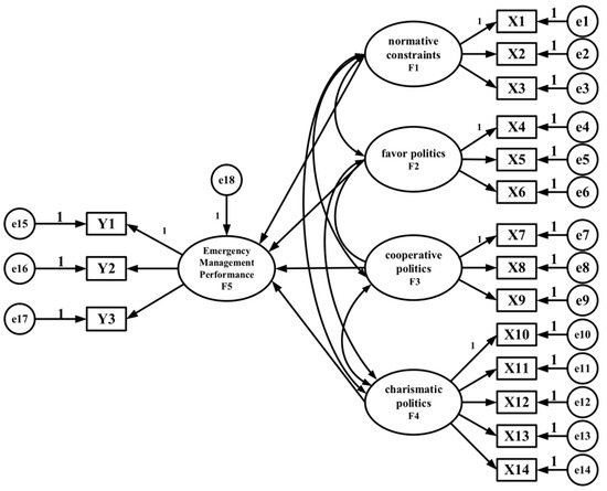 Since it is difficult for a single question to effectively and truly reflect some observed variables in this paper, these observed variables are jointly reflected by multiple survey questions. Specifically, the latent variable of favor politics (F1) is represented by three observation variables: human relationship (X1), interpersonal trust (X2), and relational authority (X3); the latent variables of normative constraints (F2) are represented by three observation variables: organizational system (X4), emergency mechanism (X5), and emergency legal system (X6); factors of cooperative politics (F3) are represented by three observation variables: vertical cooperation (X7), horizontal cooperation (X8), and diagonal cooperation (X9); factors of charismatic politics (F4) are represented by vision incentives (X10) and risk-taking behaviors (X11), care about environment (X12), care about subordinates (X13), and unconventional behavior (X14) are five observation variables. The specific scoring adopts the Likert five-level scale method [37], and the questionnaire sets a 1–5 scoring interval for the topic. The survey concludes that the favor politics measurable indicators have an average mean (3.69–4.07) and standard deviation (0.648–0.698). Normative constraints response averages of three measurable indicators were found (3.66–4.05) while standard deviation (0.673–0.761). Cooperative politics and charismatic politics have an average mean between (3.71–4.04) and (3.65–4.03) with standard deviation ranging between (0.715–0.778), respectively. Lastly, county-level EMP has an average mean of (3.88–3.99) and standard deviation of (0.682–0.771). The meaning of the measurable variables of the model along with descriptive analysis including average mean and standard deviation are shown in Table 3. The reliability and validity are discussed in the results section.