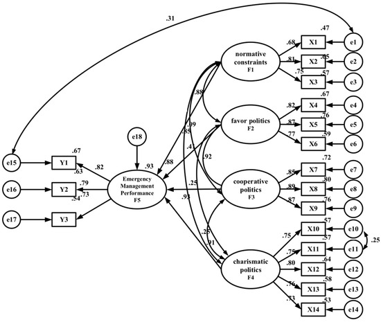 Among the observed variables included in human relations and political factors, the factor loadings of human relations, interpersonal trust, and relational authority are 0.683, 0.807, and 0.754, respectively. The influence of interpersonal trust is significantly greater than the degree of influence of human relations and relational authority on human relations politics, indicating that the relationship of trust between people plays a decisive role in the formation of human-political factors. Among the observed variables included in normative constraints, the factor loadings of organizational system and emergency mechanism on normative constraints were 0.818 and 0.874, both exceeding 0.8, indicating that these two observed variables can largely reflect normative constraints. A latent variable, while the observation variable of emergency legal system has relatively little influence. Under the latent variable of cooperative politics factor, the factor loadings of the three observed variables vertical cooperation, horizontal cooperation and oblique cooperation are 0.848, 0.894 and 0.874, respectively, which indicates that vertical, horizontal, and oblique cooperation are important factors in cooperative politics, it has a strong explanatory power for cooperative politics, and to a certain extent, it also shows that vertical, horizontal and oblique cooperative politics have positive effects on county EMP. Under the latent variable of charismatic politics, the factor loading of the observed variable focusing on the environment is 0.802, and the factor loadings of other observed variables are all below 0.8, which indicates that the perception of external risks by leading cadres in the county plays an important role in charismatic politics. At the same time, it also shows that the stronger the perception of the leading cadres to the risks inside and outside the county, the better the EMP of the county.