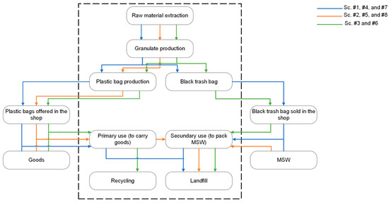 Once the three materials had been defined, the scenarios for this study were created. To develop these scenarios, two functions of the product under analysis were given (to carry goods and to pack MSW), and three patterns of plastic bag consumption observed by Brazilian citizens were considered, including: (i) obtaining the plastic bag in a commercial establishment (e.g., supermarket and shops) to carry goods, and disposal of this plastic bag in landfill together with the garbage, using a black trash bag to pack MSW; (ii) obtaining the plastic bag in a commercial establishment (e.g., supermarket and shops) to carry goods and reusing the plastic bag to pack MSW and then sending it to landfill; and (iii) obtaining the plastic bag in a commercial establishment (e.g., supermarket and shops) to carry goods and sending the plastic bag to recycling, but using a black trash bag to pack MSW to send it to landfill. In this sense, eight analysis scenarios were prepared, as shown in Table 1.