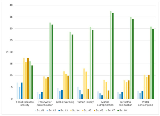 The results of the seven impact categories for each scenario using ReCiPe 2016 Midpoint (H) are presented in Table 6.