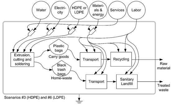 The data used in this work were primary data regarding the composition of each polymer (HDPE, LDPE, and TPS) and the manufacturing process to produce plastic bags. Regarding the manufacturing process steps, we considered using energy and water, excluding equipment such as extrusion, cutter, and solder. Equipment was excluded from the LCIs, given that all plastic bags analyzed go through the same processes. We did not consider dyes and additives for the black trash bag due to the lack of data available for on-site collection. For the recycling processes, we considered the electricity used to sort plastic waste in a waste sorting plant. Equipment was not considered in the recycling process. For the logistic processes, we considered an average distance of 100 km to transport plastic waste from home to landfill and home to recycling. Given the average distance traveled by the lorry from collection to destination (landfill or waste sorting plant) in the municipal waste collection service, this distance was considered. Logistic processes to transport plastic bags from manufacturing processes to the place to be consumed (e.g., supermarket) were not considered due to the lack of reliable information and the wide range of options for locations where the product can be manufactured.