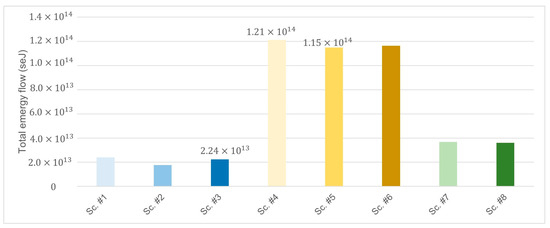 A table calculating the total emergy flow and the renewability index for each scenario was prepared (Table 7). The tables with the emergy calculation memorial for each scenario are available in the Supplementary Materials.