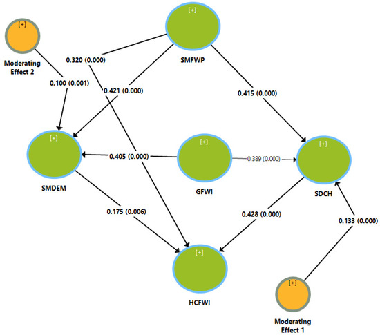 The result of hypothesis testing showed significant relationships among the variables that indicate SMFWP, SMDEM, and SDCH shape HCFWI. Social media promotions had a significant effect on the path from SMFWP to HCFWI (Beta = 0.320) and thus significantly influenced customers’ intention to reduce food waste. Furthermore, the SMDEM to SMFWP path was also significant (Beta = 0.421), showing that social media leads to sustainable behavior. Results provided support for the relationship between SMDEM and HCFWI (Beta = 0.175), indicating that environmentally motivated customers have stronger food waste reduction intentions. Confirming that gratitude increased environmental motivation to reduce food waste, SMDEM (Beta = 0.071) was also mediated through GFWI. Results for SMFWP showed a positive effect on SDCH (Beta = 0.415), and SDCH was found to be significantly related to HCFWI (Beta = 0.428). This indicated a positive relationship between customer happiness due to supporting sustainability and food waste reduction intentions. Additionally, GFWI moderated the effect of SMDEM and SDCH on HCFWI (Beta = 0.017; Beta = 0.057), such that environmental motivation and happiness increased their influence on food waste intentions. The model explanatory power is shown by the R-square values. The model explained 40.9% of the variance for HCFWI. The model explained 43.3% of the variance in SDCH and 38.2% of the variance in SMDEM. Table 4 includes more detail and Figure 1 represents the structural model of this study.