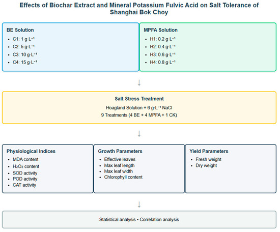 Previous studies investigating the effects of salt stress and related amendments on crops have primarily been conducted in soil environments, where factors such as soil porosity and microbial activities may confound the results. Research specifically examining how water-soluble substances from these two amendments enhance crop salt tolerance remains limited. Given the potential of biochar and potassium fulvic acid in improving crop salt tolerance and productivity in soil cultivation, we hypothesized that the application of BE and MPFA in hydroponic systems could positively affect the antioxidant responses, photosynthetic efficiency, and productivity of Shanghai Bok Choy. This study had two primary objectives: (1) to compare and analyze the effects of different amendments on the antioxidant responses, photosynthetic efficiency, and growth parameters of Shanghai Bok Choy under saline conditions; and (2) to determine the optimal amendment type and application rate for specific mineralization levels, providing empirical support for the efficient utilization of saline groundwater and the simultaneous improvement of Shanghai Bok Choy quality and yield in the Yellow River Delta region.