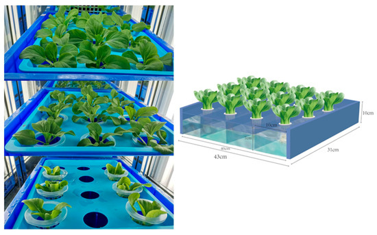 Bok Choy (Shanghai Bok Choy) was selected as the experimental crop due to its economic importance and salt sensitivity. The hydroponic cultivation of Shanghai Bok Choy was conducted from 6 March to 16 April 2023, in an artificial climate chamber (RGX-180F, Shanghai Lichen Instrument Technology Co., Ltd., Shanghai, China) at Shandong University of Technology, China. The seeds were sown in seedling cotton cubes (10 × 10 × 10 mm), placed in trays containing a half-strength nutrient solution under LED illumination. After five days of germination with a 100% success rate, the seedlings showing uniform growth were selected for the cultivation experiment. An experimental methodological chart is shown in Figure 1. The seedlings with their cotton cubes were transferred to planting baskets (outer diameter 70 mm, inner diameter 48.5 mm, height 70 mm) in hydroponic boxes (Figure 2), with the nutrient solution submerging half of the seedling cotton. The treatments consisted of the control (CK); the BE at 1, 5, 10, and 15 g L−1 (C1, C2, C3, and C4, respectively); and MPFA at 0.2, 0.4, 0.6, and 0.8 g L−1 (H1, H2, H3, and H4, respectively). All the treatments were conducted in nutrient solution (Figure 2), with three replicates. As shown in Figure 2, each cultivation box contained four columns, with three plants per column, utilizing three boxes in total. The seedlings were grown for 40 days under controlled conditions: 14 h photoperiod at 25 °C with 18,000 lx light intensity during the day and 10 h dark period at 20 °C during the night, maintaining 50% relative humidity throughout. On 16 April 2023, all the plants were harvested, weighed, and stored in frozen form until the subsequent analysis.