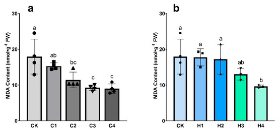 The MDA content of hydroponically grown Shanghai Bok Choy leaves decreased with an increase in the concentration of BE (Figure 3a). Specifically, C3 and C4 treatments exhibited the lowest MDA content compared to the other treatments, differing significantly from each other and were approximately 50% lower than the CK treatment. Adding MPFA reduced the leaf MDA content, and the lowering effect was more significant with increasing amounts (Figure 3b). Treatment H4 exhibited the lowest MDA content, 46% lower than the CK treatment and 27.47% lower than H3. Both BE and MPFA reduced the MDA content of Shanghai Bok Choy leaves under salt stress. The BE treatment resulted in the lowest MDA content in the C3 and C4 treatments, whereas the MPFA treatment resulted in the lowest MDA content in the H4 treatment. Treatments C3 and C4 demonstrated superior efficacy in reducing MDA levels compared to treatment H4.