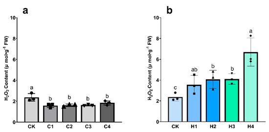 Adding BE reduced the intracellular H2O2 content (Figure 4a). However, the difference was insignificant among the treatments with the addition of different concentrations, with a minimum 33% reduction in H2O2 content compared to the CK treatment. Adding MPFA significantly increased the H2O2 content in all the treatments, with the highest H2O2 content observed in the H4 treatment (Figure 4b). It was observed that under 6 g/L NaCl stress, the addition of BE to the nutrient solution reduced the H2O2 content of Shanghai Bok Choy leaves, which was beneficial for alleviating the damage caused by 6 g/L NaCl stress on Shanghai Bok Choy leaves. Conversely, MPFA increased the H2O2 content of Shanghai Bok Choy leaves under 6 g/L NaCl stress, which was detrimental to the growth of Shanghai Bok Choy plants.