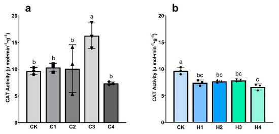 It was observed that with an increase in the added concentration of BE, the catalase activity in the Shanghai Bok Choy leaves first increased and then decreased, peaking in the C3 treatment, which was 40.57% higher than that of the CK treatment (Figure 5a). However, no significant difference between any of the other treatments was observed, except for the C3 and CK treatments. The addition of potassium fulvic acid decreased the CAT enzyme activity in Shanghai Bok Choy leaves, and there was no significant difference in regard to the varying concentrations, except for the H4 treatment, which exhibited the lowest CAT enzyme activity as the added concentration increased (Figure 5b). The BE increased the CAT activity of Shanghai Bok Choy leaves under 6 g/L NaCl stress and the C3-treated Shanghai Bok Choy leaves exhibited the highest CAT activity. Contrarily, the application of MPFA did not exhibit significant positive effects. In contrast, BE demonstrated superior efficacy in enhancing catalase (CAT) activity compared to MPFA.