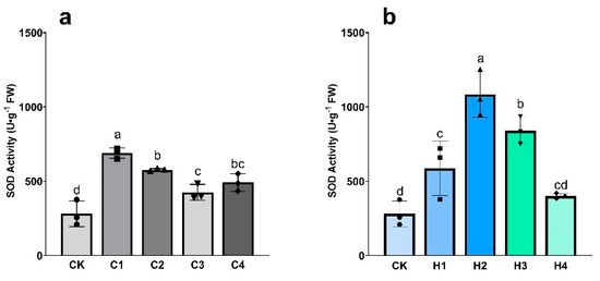 The SOD activity in the Shanghai Bok Choy leaves was significantly increased in all the treatments with the BE (Figure 6a). The SOD activity decreased and then increased with an increase in the concentration of the BE. Specifically, the SOD activity of Shanghai Bok Choy leaves in the C2, C3, and C4 treatments increased by 105.4%, 51.7%, and 75.0%, respectively, compared to that of the CK treatment. The highest SOD activity increase (145.7%) was observed in the C1 treatment compared with that of the CK treatment. Furthermore, the addition of MPFA increased the SOD activity in Shanghai Bok Choy leaves (Figure 6b). There was an initial increase in SOD activity with an increase in the concentration of MPFA, which then decreased. The H2 treatment resulted in the highest increase in SOD activity by 286.9%, while the H1, H3, and H4 treatments increased the SOD activity of Shanghai Bok Choy leaves by 109.0%, 200.0%, and 43.0%, respectively. The addition of a concentration higher than that of the H2 treatment resulted in a decrease in SOD activity. No significant difference was observed between treatments H4 and H1. Both BE and MPFA increased the SOD activity of Shanghai Bok Choy leaves, and the most significant increase in SOD activity was observed in the H2 and H3 treatments involving MPFA.