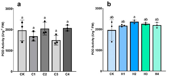 The POD activity of Shanghai Bok Choy leaves treated with BE did not differ significantly from that of the CK treatment and demonstrated no discernible pattern of change (Figure 7a). No statistically significant differences were observed between the MPFA interventions. There was little difference in the POD activity of the Shanghai Bok Choy leaves between the different concentrations of MPFA (Figure 7b). The H2 treatment exhibited the highest increase in POD activity (20.4%) compared to the CK treatment. The H1, H3, and H4 treatments also demonstrated increases of 10.7%, 15.3%, and 12.1%, respectively, compared with the CK treatment, but these increments were not statistically significant. The analysis revealed no significant effect of the two additives on the POD activity of Shanghai Bok Choy leaves.