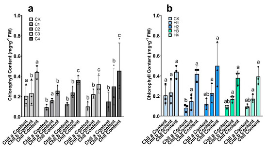 The effect of the BE on the chlorophyll content of the Shanghai Bok Choy under salt stress (Figure 8a). The chlorophyll content of each treatment demonstrated an overall decreasing trend with an increase in the concentration, and the magnitude of the decrease varied for different concentrations. The addition of the BE reduced chlorophyll a. No significant differences were observed among the added concentrations. Figure 8a indicates no significant difference in the chlorophyll b content of hydroponic Shanghai Bok Choy leaves among all the treatments, including the BE. The total chlorophyll content decreased with the addition of the BE, with the C1 treatment demonstrating the highest reduction of 54.1%, followed by a tendency to increase and subsequently decrease. The MPFA reduced the chlorophyll content of Shanghai Bok Choy leaves under salt stress, but lacked a significant difference between the added concentrations (Figure 8b). Only the H2 treatment indicated an insignificant difference in leaf chlorophyll, whereas all the other treatments with increased concentrations exhibited lower chlorophyll b content than the CK treatment and produced significant differences. The response of the total chlorophyll content to MPFA was similar to that of chlorophyll b. The total chlorophyll content of Shanghai Bok Choy leaves treated with MPFA was lower than that of the CK treatment, with no significant difference. The total chlorophyll content in the H2 treatment exhibited the least reduction (21.4%), which was lower than that of the CK treatment. The analysis concluded that both additives were detrimental to the increase in chlorophyll content in Shanghai Bok Choy leaves.
