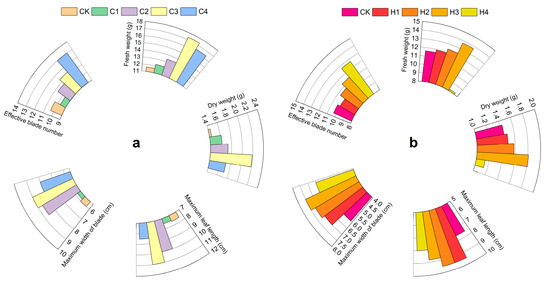 The leaf area of a plant reflects crop growth and the area that absorbs light energy; a larger leaf area signifies greater light absorption. Figure 9 indicates that using BE and MPFA resulted in varying degrees of increase in the maximum leaf length and width in Shanghai Bok Choy under salt stress. Among these treatments, the C3 treatment (BE 10 g/L) demonstrated the highest efficacy, with increases of 44.7% and 50.0% compared to the CK treatment, followed by the H2 treatment (MPFA 0.2 g/L), which was the most effective, increasing by 25.0% compared with that of CK. An increasing trend was observed in regard to both the maximum leaf length and maximum leaf width with increasing concentrations of BE, followed by a decrease. Similar trends were observed for the MPFA treatments. As the concentration of the BE increased, the number of effective leaves on the Shanghai Bok Choy gradually increased, and the C4 treatment produced the highest number of effective leaves. These findings indicated that the BE was more effective in terms of promoting leaf growth than MPFA, and the maximum leaf length, maximum leaf width, and effective leaf number of the Shanghai Bok Choy in regard to the C3 and C4 treatments were significantly increased.