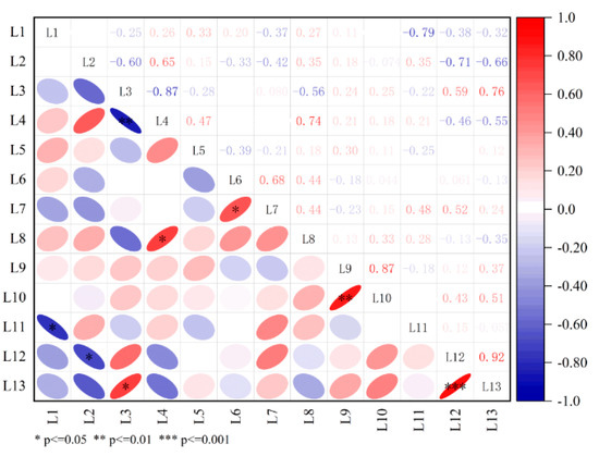 The correlation analysis of L1–L13. L1 is MDA content, L2 is H2O2 content, L3 is CAT activity, L4 is POD activity, L5 is SOD activity, L6 is chlorophyll a content, L7 is chlorophyll b content, L8 is total chlorophyll content, L9 is maximum leaf length, L10 is maximum leaf width, L11 is effective leaf number, L12 is fresh weight, L13 is dry weight; “*”, “**”, and “***” indicate significant difference at 5%, 1%, and 0.1% level, respectively.