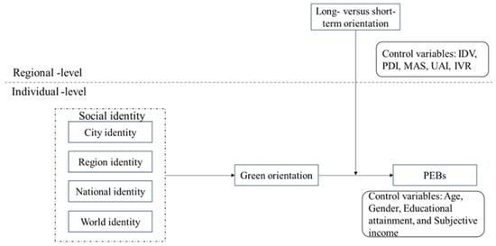 The HLM analysis was conducted with individual-level variables (social identity forms, green orientation, and PEBs) and control variables (gender, age, income, and education) at the first level and regional-level variables (LTO, PDI, IDV, MAS, IVR and UAI) at the second level.