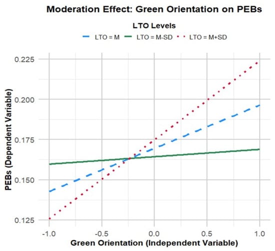 The interaction term between green orientation and LTO was significant (Model 7: β = 0.022, p < 0.01), indicating that the effect of green orientation on PEBs is moderated by societal long-term versus short-term orientations (see Figure 2). Specifically, the relationship was stronger in long-term-oriented societies. This supports Hypothesis 3, confirming the moderating effect of LTO on the green orientation and PEBs relationship.