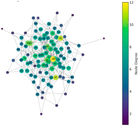 Organizational collaboration network in Ghana. Note: The dataset consists of 100 organizational nodes, and 300 edges representing connections through patents and collaborations, with a network density of 0.06. Thus, density = 2 × E/N × (N − 1).