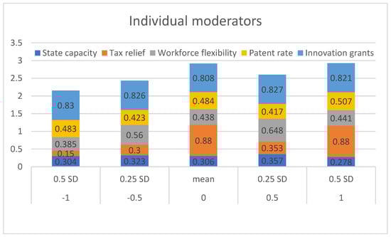 Table 3 summarizes the IV results. Panel X shows estimates using external instruments, while Panel Y uses Quiroga’s instruments. The Sargan overidentification test does not reject the null hypothesis in all models, suggesting that the instruments used are appropriate and valid. The Cragg–Donald statistics show robust instruments, especially in Panel X, with minimum F-statistics well above the threshold of 104.7 []. Panel Y, however, shows weaker instruments, particularly in interaction models.