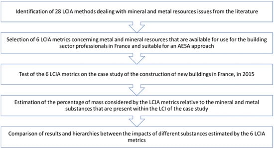 This section aims to identify the best LCIA candidate method, among LCIA existing metrics relative to mineral and metal resources use, for an LCA-based AESA approach in the building sector. Firstly, AESA methods that consider an indicator for mineral and metal resources are reviewed. Secondly, the LCIA methods identified in the literature are selected based on three criteria (availability of the method in LCA software commonly used among the building sector and the resource stakes considered by the LCIA method). Finally, an analysis methodology is applied to the selected LCIA methods. The analysis methodology is achieved by releasing an LCA on new construction in France in 2015. Figure 1 presents the methodological steps followed in this study.