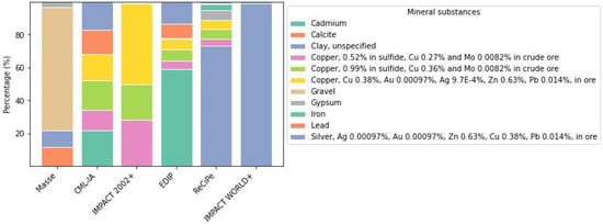 The inventory analysis was conducted on the defined case study using the Ecoinvent 3.5 database [26]. As a result of the inventory analysis, 501 flows were obtained including 133 mineral and metal flows of 4.57 × t. The five heaviest mineral or metal substances are: “gravel” (3.39 × t); “calcite” (5.15 × t); “clay, unspecified” (4.68 × t); “Gypsum” (1.47 × t); “Shale” (1.37 × t).