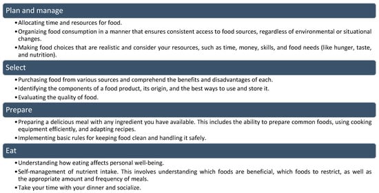 Similarly, Vidgen and Gallegos [8] stated that food literacy is “composed of a collection of inter-related knowledge, skills and behaviors required to plan, manage, select, prepare and eat food to meet needs and determine intake”.
