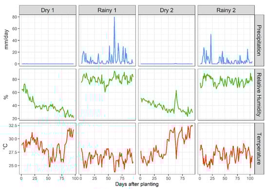 Two fields were subject to monitoring during the dry season: Field 1 (Year 1), spanning an area of 24.88 hectares (11°55′23.8″ S, 49°41′40.7″ W, altitude 193 m), and Field 3 (Year 2), encompassing 18 hectares (11°49′02.8″ S, 49°39′15.4″ W, altitude 190 m). Additionally, two fields were monitored during the rainy season: Field 2 (Year 1), covering 7.12 ha (11°48′10.3″ S, 49°00′29.3″ W, altitude 285 m), and Field 4 (Year 2), with an area of 15.84 ha (11°45′20.9″ S, 48°51′24.2″ W, altitude 262 m). The soil type classification in Fields 1 and 3 is plinthosol; in Fields 2 and 4, it is oxisols. A uniform planting spacing of 0.45 × 0.10 m was maintained across all fields, and standard cultivation practices, including insecticides and fungicides, were consistently implemented [18]. Throughout the entire cultivation, four applications of fungicides, four applications of insecticides, and three applications of herbicides were carried out. The concentrations used were in accordance with the manufacturers’ instructions. The insecticides applied (active ingredient (chemical subgroup)) were acetamiprid (neonicotinoid), bifenthrin (pyrethroids), diflubenzuron (benzoylureas), and methomyl (carbamates), and the entomopathogenic fungi Isaria fumosorosea (strain ESALQ-1296). The fungicides included (active ingredient (chemical group)) azoxystrobin (strobilurin), boscalid (carboxamides), epoxiconazole (azole), fludioxonil (phenylpyrrole), and pyraclostrobin (strobilurin). Finally, the herbicides applied were (active ingredient (chemical group)) clethodim (cyclohexanedione), diquat dibromide (bipyridinium), and glyphosate (organophosphorus). Throughout the study, meteorological stations at each location facilitated the monitoring of daily average air temperature, precipitation levels, and relative humidity (Figure 1).