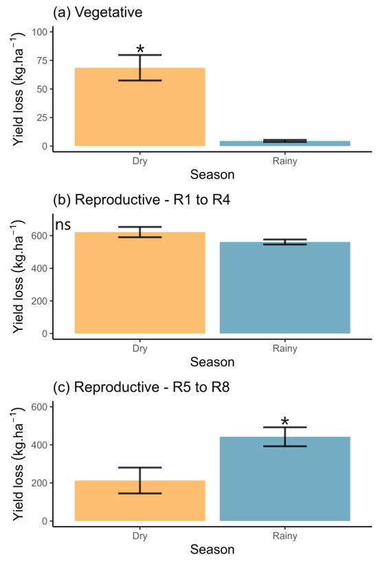 Yield loss (average ± standard error) in Bt soybean crops estimated during the vegetative (a) and reproductive (b,c) phenological stages, categorized by the cultivation season in Tocantins state, north Brazil. Vegetative stages encompass the stages from emergence to the unfolding of trifoliate leaves. Reproductive R1 to R4 refers to the period from beginning flowering to full pod. Reproductive R5 to R8 refers to the period from beginning seed to full maturity. * denotes significant differences between seasons; ‘ns’ indicates non-significant differences.