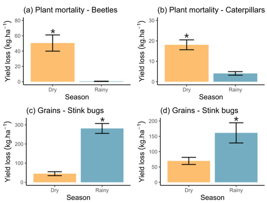 Yield loss (average ± standard error) in Bt soybean crops estimated at vegetative (a,b) and reproductive (c,d) phenological stages according to the cultivation season in Tocantins state, north Brazil. In (a) and (b), the loss is caused by the attack of beetles and caterpillars, respectively. In (c) and (d), the loss is caused by stink bugs and fungi attacks. * denotes differences between seasons.