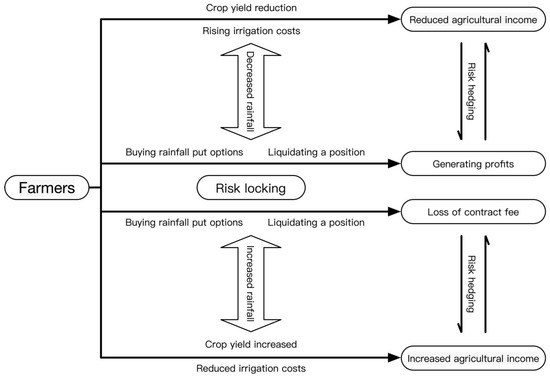 As shown in Figure 1, a farmer concerned about the possibility of unusual weather conditions adversely affecting crop yields can acquire corresponding weather derivatives. Suppose that unfavorable weather changes result in reduced crop production. In that case, the farmer can liquidate the weather derivatives in the financial market, thereby generating profits to offset the losses incurred due to diminished crop yields. If the weather behaves contrary to their expectations, the farmer will only suffer the contract fees associated with the derivatives, and these expenses are foreseeable. In other words, by purchasing weather derivatives, the farmer can confine the weather risk to a manageable range, thereby achieving the goal of stabilizing agricultural income. This approach not only aids farmers in reducing income uncertainty but also offers an effective means of addressing the potential impacts of weather fluctuations on agricultural economics. Furthermore, the flexibility and customizability of weather derivatives bestow upon farmers a natural and substantial advantage in addressing the diverse risk management needs faced by various individuals working in agriculture. Notably, the decreased or increased precipitation in the figure refers to non-disastrous weather fluctuations.