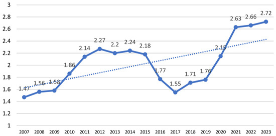 As previously discussed, when the corn price is 3 CNY per kilogram, each hectare of corn farmers buying 6.22 units of derivative contracts for cumulative rainfall put options can effectively hedge 67.9% of the yield fluctuation risk. Nevertheless, given the price volatility of corn, it is essential to investigate whether cumulative rainfall put options can sustain their risk mitigation effectiveness at various price levels. The chart below displays the price trend of corn in the Inner Mongolia Autonomous Region from 2007 to 2023.