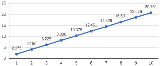A more in-depth analysis of Equation (6) reveals that the variable P directly multiplies with other components, while the other features remain unaffected by . This implies that acts as a multiplier, leading to an increase in as increases. However, changes in hedging efficiency are challenging to analyze through Equation (7) mathematically. To further confirm the derived results, this study assumes that corn prices fluctuate from 1 to 10 CNY/kg while keeping other parameters constant. The objective is to investigate how weather derivatives’ hedging efficiency and the optimal trading quantity change at different corn prices. The results are depicted in following Figure 5 and Figure 6. When corn prices fluctuate between 1 and 10 CNY/kg, the optimal quantity of weather derivatives does, as previously analyzed, increase with rising prices. At the optimal trading quantity, the risk mitigation efficiency of derivatives remains constant. Therefore, derivatives can still effectively fulfill their role in weather risk management under different price scenarios.