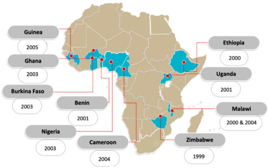 The markets are highly varied across the 10 sub-Saharan African countries included in this study. Generally, most smallholder farmers are not integrated into commercial markets due to a lack of information, high transportation costs, and limited assets [40]. However, many households participate in local or regional farmers’ markets; these markets vary greatly within and across countries in terms of formality, size, frequency, season, and types of foods sold. In more urban spaces, farmers’ markets may be more formal, larger, and contain a greater variety of crops sold, while more rural markets may be informal, smaller, and less diverse.