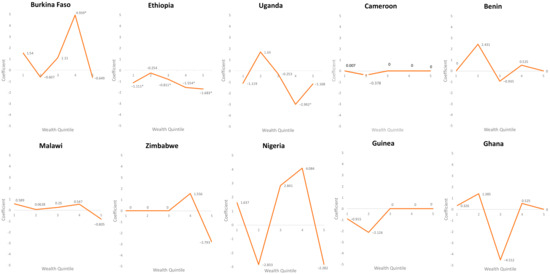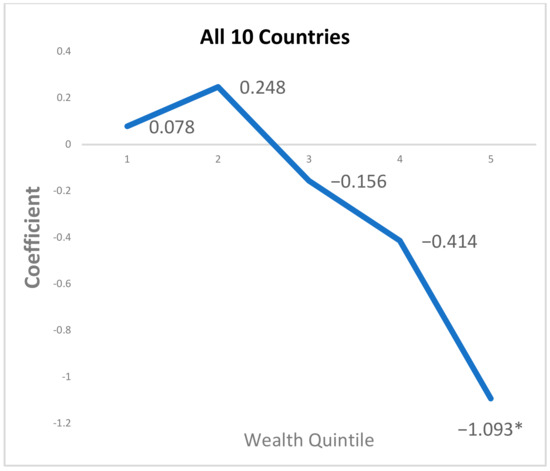 First, we conducted an OLS regression including all 10 countries to understand the relationship between crop diversity and dietary diversity across the wealth quintiles. Table 1 displays the results of these regressions controlling for sociodemographic, geographic, and climate variables. We find that in the richest wealth group, there is a statistically significant (p < 0.05) negative association between SDI at 10 km and HDDS, and further that the richest wealth group has the greatest negative association. Furthermore, we find that after accounting for income, there are different patterns regarding the association between SDI and HDDS across the poorest, poorer, and middle-wealth groups. We also find that the education of the mother is consistently a significant predictor of the dietary diversity of a household across wealth groups.