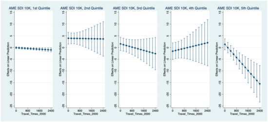 Figure 4 shows the estimated marginal effect of SDI on HDDS based on households’ distance to markets. We include all 10 countries and consider the marginal effects in each wealth quintile. Travel time is measured in minutes and is used as an indicator of market access. We find two main patterns within these analyses. First, we find that SDI has a positive impact on HDDS among poorer households (Quintile 2), but only for households that are relatively closer to markets. The impact of SDI on HDDS is more ambiguous in lower-income households further from markets. Next, we again see that the only negative association between SDI and HDDS is among the richest households. Further, we note that the marginal effect of SDI on HDDS in Quintile 5 is the most negative in households that are furthest from markets. However, these findings may reflect a small sample size, as there are few households with high socioeconomic standing that are far from markets. Quintile 5 may also contain many households that are higher-income monoculture farmers, as well as potentially households that do not expect farming to be their primary source of income or food (investors or hobby farmers). We note that travel time does not appear to explain the discrepancies in the association between SDI and HDDS across wealth quintiles—rather, the findings in Figure 4 again suggest that other variables not yet accounted for in our models may be shaping the association between crop diversity and dietary diversity.