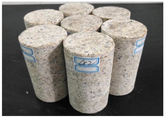 Utilizing granite sourced from the roof strata of a coal mine in Shaanxi Province, China, with a density of 2850 kg/m3 and a longitudinal wave velocity of 5.0 km/s, experimental specimens were fabricated in accordance with the standards set by the International Society for Rock Mechanics. The granite was processed into standardized specimens with a diameter of 50 mm and a height of 100 mm, ensuring that deviations in parallelism and perpendicularity were controlled to within ±0.2 mm. To mitigate the impact of natural variations in rock specimens on experimental outcomes, samples devoid of conspicuous surface defects were selected for testing. A total of 7 granite standard cylindrical specimens, which were numbered G1–G7, were prepared for the experiment. Before the start of the experiment, their wave velocities were tested. Among them, the wave velocities of specimen G6 were significantly lower than those of other specimens, and thus, G6 was not utilized further. The prepared granite specimens are shown in Figure 1.