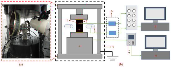 AE–EMR monitoring and testing system. (a) Testing system; (b) Schematic diagram of the experimental system; (1) Sample and insulating aper; (2) AE sensor; (3) EMR antenna; (4) Press; (5) Shielding room; (6) Preamplifier; (7) Servo controller; (8) AE/EMR monitoring system; (9) Press control system.