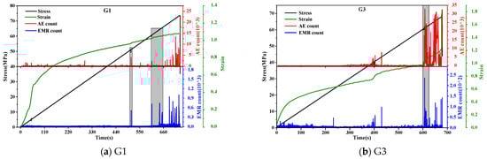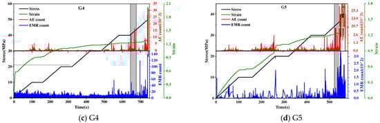 Count values, as a crucial temporal parameter of AE–EMR signals, reflect the signal’s activity. Consequently, for the subsequent analysis and research, we selected the count as an illustrative parameter. Figure 3 illustrates the temporal evolution of the stress, strain, AE counts, and EMR counts during the loading processes of four representative specimens labeled G1, G3, G4, and G5. The deformation and fracture of rocks during the loading process often involve four stages: compaction, elastic deformation, plastic deformation, and unstable failure. In terms of the overall trend, the variation patterns of the AE and EMR counts tended to synchronize during the deformation and fracture processes of granite under load. Specifically, with increasing load, both the AE and EMR signals gradually intensified, reaching their peak near the peak stress. The AE–EMR signals exhibited distinct stage–wise characteristics throughout the deformation and fracture process.