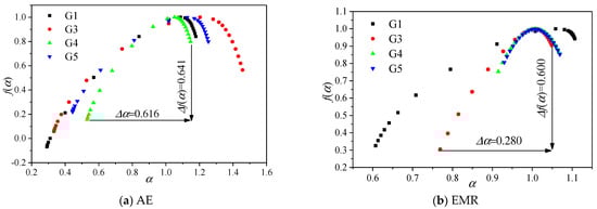 According to multifractal theory, the multifractal spectrum characteristic parameters can reflect the unevenness of the distribution of the AE (EMR) data. α represents subsets of the AE (EMR) signal data with different intensities. αmin denotes the subset of data with strong signals, while αmax represents the subset with weak signals. Δα = αmax − αmin reflects the diversity in the distribution of signal intensities, with a larger Δα indicating more pronounced fractal features. f(α) represents the frequency at which the AE (EMR) signal subsets with a roughness of α appear in the entire sequence, where f(αmin) represents the frequency of occurrence of strong signals, and f(αmax) represents the frequency of occurrence of weak signals. Δf = f(αmax) − f(αmin) reflects the proportion of strong and weak signals, with Δf > 0 indicating a prevalence of weak signals and Δf < 0 indicating a prevalence of strong signals. Figure 4 illustrates the multifractal spectra of the AE and EMR counts for a typical granite specimen throughout the entire loading period. Both spectra exhibited a right–hook shape, with Δf consistently greater than 0, suggesting that the performance of the AE-EMR signals, which were induced by small fracture events throughout the loading process, was superior. The width of the multifractal spectrum Δα for the AE was notably larger than that for EMR, indicating greater variability in the distribution of the AE signals. While multifractal spectra reveal the singularity of the AE/EMR signals, they do not account for the temporal factor. Therefore, dividing the time series into multiple subsets and statistically analyzing the dynamic changes in the multifractal parameters Δα and Δf for each subset was essential. The temporal evolutions of the multifractal parameters for the AE and EMR are presented in Figure 5 and Figure 6, respectively.
