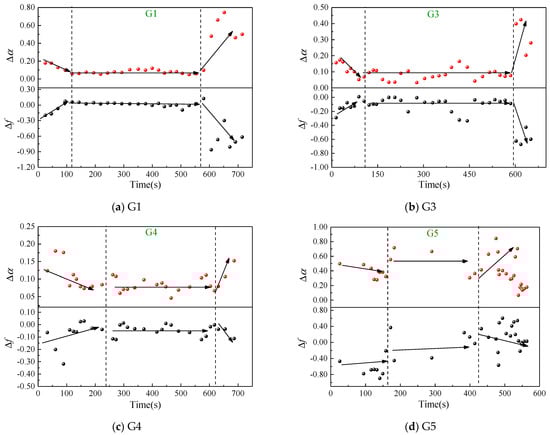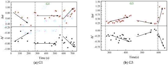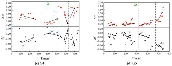 From Figure 5, it is evident that the overall trend of Δα for the AE during the loading process exhibited an initial decrease followed by an increase, while Δf showed a trend of a slight increase followed by a decrease, displaying a generally inversely synchronous pattern. Therefore, this paper focuses solely on elucidating the characteristics of Δα. In the early stages of loading, Δα experienced a minor fluctuation and decline. This phenomenon occurred because, during this loading phase, the specimen primarily underwent the internal deformation and closure of pre–existing cracks due to compression. Nearly all intrinsic cracks within the specimen participated in this process, resulting in the abundant generation of small AE signals. As the internal pre–existing cracks completely closed without initiating expansion, the production of AE signals diminished, and Δα was maintained at a lower level. Subsequently, with the continuous increase in the load level, the specimen entered a phase of uniform deformation. During this stage, the specimen predominantly accumulated elastic energy, and internal microcracks underwent stable expansion. In the later stages of the elastic phase, localized microcracks penetrated, leading to significant fractures and causing pulsed changes in the acoustic emission signals. Consequently, within this stress range, Δα exhibited a gradual upward trend. As the applied load approached the peak load, Δα experienced a substantial increase. This phase was characterized by the accumulation of sufficient energy within the specimen, accelerating the deformation. Numerous cracks in the coal body gradually converged and coalesced, triggering large–scale fractures and generating substantial AE signals. Upon reaching the peak stress, Δα rapidly rose because the AE signals reached their maximum values, significantly exceeding the earlier levels of signal intensity. The changing trends in Δα and Δf throughout the loading process effectively reflected the fracture conditions within the specimen. Particularly noteworthy is the acceleration of internal fractures, where Δα and Δf experienced a rapid increase in absolute values as the peak stress was approached. Therefore, the pronounced upward trend in the absolute values of Δα and Δf, following a prolonged period of steady fluctuations, can serve as a reliable indicator for predicting critical peak stress and imminent failure, offering an early warning for specimen damage.