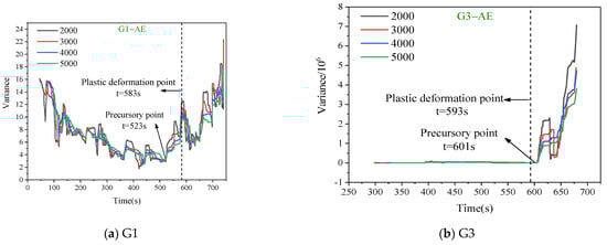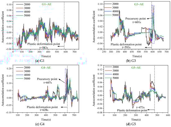 As depicted in Figure 7 and Figure 8, apart from the less pronounced fluctuations in autocorrelation and variance during the deformation process of sample G1, samples G3, G4, and G5 exhibited significant abrupt changes in the autocorrelation and variance. Taking sample G4 as an example, before entering the plastic deformation phase, the autocorrelation of the AE counts fluctuated within the range of (−0.025, 0.10). Apart from two distinct peaks near t = 400 s and 500 s, the autocorrelation remained relatively stable at other times. When loaded to t = 607 s, the autocorrelation coefficient increased from 0 to 0.20, displaying a noticeable inflection point. This shift occurred 21 s before the sample entered the plastic deformation phase at t = 628 s. In comparison with the autocorrelation, the variance exhibited significantly smaller fluctuations, making the inflection points easier to identify. Before the onset of plastic deformation, the variance was nearly zero. At t = 634 s, the variance underwent a substantial fluctuation, followed by a sudden jump. The inflection point of the variance, compared with the initiation of plastic deformation, lagged by only 6 s.