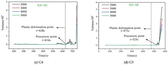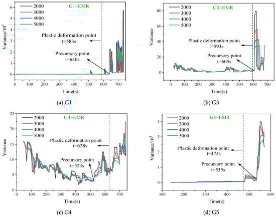 Figure 9 and Figure 10 show the temporal evolution of critical slowing–down feature parameters, namely, autocorrelation and variance, in the EMR counts. It is evident from the figure that the change trends in the autocorrelation for different specimens lacked a clear pattern, exhibiting relatively chaotic behavior with multiple instances of abrupt peaks and valleys. Notably, specimen G1 demonstrated a conspicuous anomalous spike at t = 642 s, though discerning its association with prelude to instability remained inconclusive. Conversely, distinct turning points and sudden changes characterized the variance of electromagnetic radiation signals under different window lengths. Prior to reaching the plastic deformation phase, specimens G1, G3, and G5 exhibited minimal variance in the EMR counts, almost consistently at zero, with only slight fluctuations at certain moments. However, as the plastic deformation stage was approached, a significant fluctuation in the variance of the EMR counts occurred, followed by abrupt increases. Post–increase, shorter window lengths corresponded to greater magnitudes of variance growth. Thus, the variation in window length primarily affected the amplitude of variance but had minimal impact on the critical slowing–down precursor features. In comparison with the onset of plastic deformation, the times of variance spikes in electromagnetic radiation were delayed by 58 s, 12 s, and 62 s for specimens G1, G3, and G5, respectively. However, the time of the sudden increase was ahead of the time when the rock underwent instability and failure.