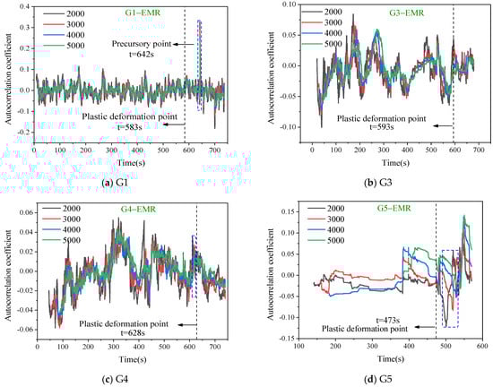 The variance and autocorrelation coefficient trend curves of the AE and EMR signals revealed that with the same lag step, the trends of autocorrelation coefficient and variance curves for different window lengths were consistent. The fluctuation decreased gradually with an increase in the window length. Hence, the choice of window length had minimal impact on the analysis of precursor characteristics. A comparative analysis of the variance and autocorrelation coefficient revealed a significantly weaker fluctuation in variance, with a more pronounced turning point during the sample’s abrupt failure.
